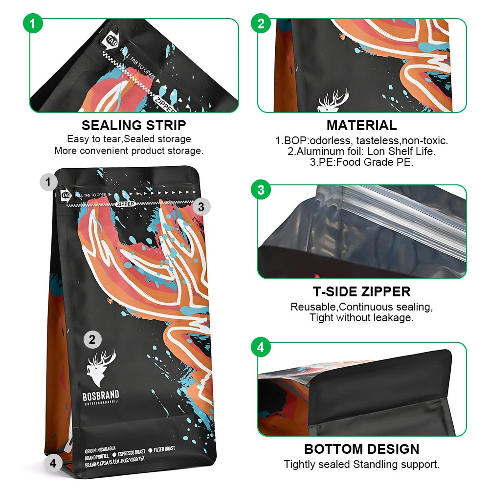 In summary, Customized Art-Printed Reclosable Plastic Coffee Bags for Single-Origin Coffee Packaging in Stores and Coffee Subscription Boxes represent a comprehensive packaging solution that combines product protection, branding impact, and consumer convenience. Designed to support the unique characteristics of single-origin coffee while meeting the operational needs of modern coffee businesses, these bags play a critical role in delivering quality, consistency, and visual appeal from production to point of consumption.